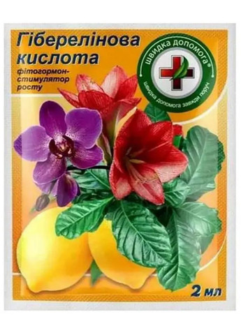 Гіберелінова кислота є важливим фітогормоном росту та молодості рослин, який синтезується в рослинних клітинах природним чином. Гібереліни здійснюють біологічну дію на синтез життєво важливих ферментів. Характерною реакцією культур на обробку є подовження стебла, посилення росту зеленої маси та подолання карликових форм рослин. Одночасно дані речовини стимулюють цвітіння, збільшують кількість зав'язей, активізують зростання насіння, цибулин та бульб. Гібереліни концентруються в швидко зростаючих органах: дозріваючому насінні, проростках і плодах, пагонах і міжвузлях, сім'ядольних і справжніх листках, що розгортаються. Завдяки дії препарату прискорюється формування плодів та покращується їхня лежкість при зберіганні. Обробка культур даним препаратом сприяє кращій адаптації рослин до несприятливих умов при вирощуванні (похолодання, посуха, недостатнє освітлення та ін.). Гіберелінова кислота використовується у вигляді водного розчину для обприскування огірків, томатів, капусти, моркви, баклажанів, перцю, картоплі, пшениці, ячменю, кукурудзи, сої, винограду, яблуні, груші, персика, вишні, смородини, полуниці, агрусу, троянд, камелій, тюльпанів, хризантем та багатьох інших культур. Переваги регулятора росту Гіберелінова кислота Регулятор росту активізує процес цвітіння, мінімізує опадання зав'язей Засіб запобігає виляганню злакових культур Стимулятор росту сприяє плодоутворенню та підвищує якість плодів Гіберелінова кислота уповільнює старіння рослин та зберігає свіжість плодів після збирання врожаю Препарат стимулює зростання та подовження стебел культур, сприяє росту зеленої маси Препарат сприяє партенокарпії (розвитку незапилених плодів) Інструкція, спосіб застосування, склад, дозування та норма витрати стимулятора росту та плодоутворення Гіберелінова кислота 2 мл Діюча речовина: гіберелінова кислота-50 г/л. Культура та норма витрати препарату: Культура Сроки и способ обработки Кількість води на 1 ампулу, (літрів) Насіння Замочування перед посівом 0.5 Кімнатні рослини Обприскування для прискорення раннього цвітіння 0.25-0.5 Обприскування для рясного цвітіння та партенокарпії 0.5-1 Розсада Обприскування на стадії 3-7 справжніх листків 0.5