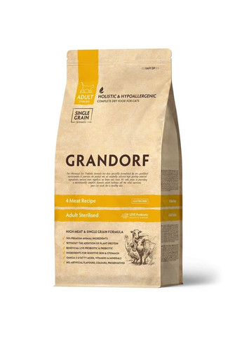 Інноваційний низькозерновий гіпоалергенний корм з живими та корисними пробіотичними бактеріями для стерилізованих котів і кішок з ослабленим й чутливим травленням, схильні до алергії на зернові. Не містить: кукурудзу, пшеницю, горох, курятину, яйця, курячий жир, субпродукти, сою, глютен, ГМО, штучні барвники, штучні ароматизатори та консерванти. 109 живих пробіотиків (1 000 000 000 один мільярд Enterococcus faecium) на 1 кг продукту. Щоденне вживання сприяє відновленню і підтримці мікрофлори кишківника. На правильній роботі системи травлення ґрунтується загальне здоров'я і стан організму вихованця. Формула насичена океанічною рибою, Omega-6 і Omega-3 жирними кислотами для чудового стану шкіри й шерсті, а знижений вміст жирів і підвищений вміст білків, а також L-Карнітин сприяють підтримці ваги та м'язової маси вихованця в оптимальній формі. Корм Grandorf з унікальною формулою забезпечує необхідний рівень кислотності сечі (pH: 6-6,5), знижуючи ризик виникнення сечокам'яної хвороби. Інновації корму GRANDORF: Живі пробіотики (стабілізатори кишкової флори); Антарктичний криль (біоелементи, біоактивні білки, фосфоліпіди Omega-3); Борошно з плоду ріжкового дерева (натуральний біорегулятор травлення); SYNOX 3D (комплекс натуральних антиоксидантів). Переваги корму GRANDORF: Гіпоалергенний склад інгредієнтів класу HOLISTIC; 1,000,000,000,000 КУО / кг живих пробіотиків (Enterococcus faecium); 70% високоякісного м'яса в складі корму GRANDORF; Понад десять корисних властивостей для здоров'я вихованця; Натуральний комплекс антиоксидантів, вітамінів і мінералів; Оптимальний баланс жирних кислот Omega-6 і фосфоліпідів Omega-3 для оздоровлення шерстяного покриву та шкіри вихованця; Формула збережена завдяки натуральним консервантам — вітамінам C і E; Особливо дбайлива технологія виготовлення корму (до 80 °С) із застосуванням високого тиску, зберігає корисні вітаміни всіх складових; Низька норма годування і висока засвоюваність досягаються використанням особливо підібраних інгредієнтів, виключно багатих поживними речовинами, що дуже корисно для здоров'я та добробуту вихованця. Корисні властивості GRANDORF: Захист серцево-судинної системи; Профілактика сечокам'яної хвороби (Склад формули підтримує необхідний рівень кислотності сечі (pH: 6-6,5), що знижує ризик виникнення сечокам'яної хвороби та підтримує здорове функціонування нирок); Профілактика зубного каменю і догляд за ротовою порожниною; Підтримка корисної та зниження патогенної мікрофлори; Підтримка здорової імунної системи; Підтримка чудового стану шкіри й шерсті завдяки жирним кислотам у складі корму; Підтримка і поліпшення зору; Поліпшення травлення і зниження харчової алергії; Поліпшення обміну речовин і підтримка ідеальної ваги; Зміцнення суглобів і розвиток м'язів; Виведення волосяних грудок. Склад: Дегідроване м'ясо індички (17%), Дегідроване м'ясо качки (16%), Дегідроване м'ясо дикого кабана (15%), Цільнозерновий коричневий рис, Сушений батат, Дегідроване м'ясо ягняти (10%), Свіже м'ясо індички (8%), Жир індички (2%), Борошно плодів ріжкового дерева, Порошок коренів цикорію (натуральне джерело пребіотиків: FOS та інулін), Рослинна клітковина, Пивні дріжджі (природне джерело MOS), Свіжа олія лосося (1%), Сушений антарктичний криль (натуральне джерело EPA і DHA, 1%), Сушене яблуко, Сушена журавлина, Юкка Мохаве. Аналітичні складові: Сирий протеїн: 37%; Сира клітковина: 2,5%; Сирий жир: 