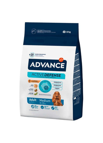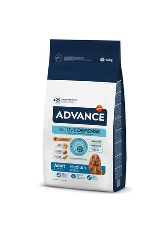 Переваги Advance Dog Adult Medium: Спеціально підібране співвідношення білків і жирів задовольнить потребу енергії у собак середнього розміру. Пірофосфати - спеціальні мінерали, очищають зуби від зубного нальоту й утворення каменю. Містить необхідну кількість жирних кислот для здоров'я шкіри та шерсті. Амінокислота таурин забезпечує правильне функціонування серця. Оптимальний рівень білка дозволяє підтримувати оптимальну м'язову масу. Натуральні волокна, пре- та пробіотики сприяють нормалізації травлення. Склад: Курка (20%), цільнозернова пшениця (17%), дегідровані білки домашньої птиці, рис (10%), жир домашньої птиці, кукурудзяне борошно, дегідрований горох (4%), дегідровані білки свинини, гідролізовані тваринні білки (домашня птиця, свинина, риба), цільнозернова кукурудза, кукурудзяний білок, буряковий жом (2%), горохова клітковина, пшенична крупка, інулін цикорію (0,8%), mінерали, плазматичні білки свинини (природне джерело імуноглобулінів) (0,4%). Аналітичний склад: Сирий протеїн 25%; сирий жир 16%; сира клітковина 3%; сира зола 7%; омега-3 0,3%; омега-6 2,9%. Вітаміни та добавки, на 1 кг: Вітамін A 27000 МО; вітамін D₃ 1200 МО; вітамін E 500 мг; вітамін C 70 мг; cульфат залiза (ІІ), моногідрат 260 мг (Fe: 86 мг); йодид калію 1,9 мг (I: 1,4 мг); пентагідрат сульфату міді(II) 33 мг (Cu: 8,8 мг); моногідрат сульфату марганцю 123 мг (Mn: 40 мг); моногідрат сульфату цинку 406 мг (Zn: 148 мг); селеніт натрію 0,2 мг (Se: 0,1 мг). Зоотехнічні добавки: Стабілізатор мікрофлори кишківника: Bacillus velezensis DSM 15544 1x109 КУО. Рекомендації по годуванню: Темперамент собаки Вага собаки, кг 10 15 20 25 30 Кількість корму на добу, г Помірно активні собаки 135 180 225 265 305 Активні собаки 160 220 270 320 370 Дуже активні собаки 210 285 355 420 480 Добові норми можуть змінюватися в залежності від рівня активності, погодних умов, а також у зв'язку з індивідуальними особливостями тварини. У всіх випадках добова норма регулюється в залежності від віку та фізіологічного стану тварини. Поруч з кормом завжди повинна знаходитися миска зі свіжою і чистою водою. Для додаткової інформації вивчіть рекомендації на упаковці корму.