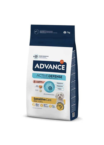 Його рецептура, містить в складі один білок, який складається з лосося як єдиного джерела білка тваринного походження, разом з рисом, робить корм легкозасвоюваним продуктом, ідеальним для собак з чутливими шлунками. Цей збалансований сухий корм розроблений спеціально для собак малих порід (собаки вагою до 10 кг). Корм ідеально підходить для тварин, які страждають харчовими алергіями, часто пов'язаними з проблемами травлення. Переваги Advance Dog Sensitive Mini: Основою корму та основним джерелом протеїнів є м'ясо лосося, яке належати до дієтичних продуктів, легко засвоюється організмом тварини та не викликає алергічних реакцій. Сухий корм Advance для собак містить вітаміни та жирні кислоти Омега 3 і Омега 6, які забезпечують здоров'я шкірного покриву і блиск шерсті, знижують ризик серцевих захворювань і зміцнюють імунітет. Стабілізатори мікрофлори кишківника Bacillus Velezensis (пробіотики), що входять до складу, підтримують баланс мікрофлори кишківника та зміцнюють загальне здоров'я. Інулін (пребіотик) сприяє зростанню корисної флори кишківника, збільшуючи поглинання поживних речовин і зменшуючи неприємний запах фекалій. Лігноцелюлоза (джерело рослинної клітковини) допомагає контролювати вагу улюбленця й забезпечує йому відчуття насичення. Вітамін Е захищає клітини від вільних радикалів і допомагає посилити імунітет. Поліфеноли разом з вітамінами допомагають затримувати старіння клітин. Спеціальні мінерали, що входять до складу кормів Едванс для собак допомагають запобігти утворенню зубного нальоту і сприяють свіжому подиху. Склад: Лосось (18%), кукурудзяний білок, рис (14%), цільнозернова кукурудза, дегідровані лососеві білки, тваринний жир, дегідрований горох (4%), кукурудзяне борошно, гідролізовані дріжджі, мінерали, буряковий жом, інулін цикорію (0,8%), лігноцелюлоза. Аналітичний склад: Сирий протеїн 27%; сирий жир 18%; сира клітковина 2,5%; сира зола 7%; омега-3 0,7%; омега-6 3%. Вітаміни та добавки, на 1 кг: Вітамін A 27000 МО; вітамін D₃ 600 МО; вітамін E 500 мг; вітамін C 70 мг; біотин 0,35 мг; сульфат заліза (II), моногідрат 260 мг (Fe: 86 мг); йодид калію 1,9 мг (I: 1,4 мг); пентагідрат сульфату міді (II) 33 мг (Cu: 8,8 мг); моногідрат сульфату марганцю 123 мг (Mn: 40 мг); моногідрат сульфату цинку 425 мг (Zn: 155 мг); селеніт натрію 0,2 мг (Se: 0,1 мг). Зоотехнічні добавки: Стабілізатор мікрофлори кишечника: Bacillus velezensis DSM 15544 1x109 КУО. Рекомендації щодо годування: Рівень активности Вага тварини, кг 1 3 5 7 10 Кількість корму на добу, г + 25 55 80 105 135 ++ 30 65 95 125 165 +++ 40 85 125 165 210 Добові норми можуть змінюватися залежно від рівня активності, погодних умов, а також у зв'язку з індивідуальними особливостями тварини. У всіх випадках добова норма регулюється залежно від віку та фізіологічного стану тварини. Поруч з кормом завжди повинна знаходитися миска зі свіжою і чистою водою. Для додаткової інформації вивчіть рекомендації на упаковці корму.