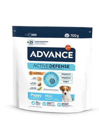 Advance Mini Puppy є збалансованим кормом, складеним для задоволення спеціальних харчових потреб цуценя дрібної породи за рахунок сприяння розвитку його травної та імунної систем, допомоги у зміцненні його захисних сил та забезпечення належного зростання його кісток з використанням корму, який легко засвоюється. Розмір гранули Advance Mini Puppy адаптований до розміру щелеп щеняти дрібної породи. Корм для цуценят малих порід (вага дорослої особини до 10 кг) віком до року і вагітних і самок, що годують. Також у нас ви можете підібрати і купити корм Advance Mini Puppy для собак різних порід та вікових груп. Переваги Advance Mini Puppy: Багато жиру та білка спеціально для рухомих цуценят. Збільшується м'яз і підтримується висока активність у собак міні порід. Для правильного розвитку скелета у цуценя корм насичений кальцієм та фосфором Запорука здоров'я у цуценя вибудовується з перших місяців його життя, тому для формування нервової системи, зору, шкіри та вовни в кормі присутні у необхідній кількості жирні кислоти Омега 3 та Омега 6. Стабілізатори мікрофлори кишечника Bacillus Velezensis (пробіотик) підтримують баланс мікробіоти в кишечнику, а інулін (пребіотик) сприяє зростанню корисних бактерій. Активні імуноглобуліни сприяють покращенню травлення та підтримують здоров'я кишечника. Нуклеотиди виступають будівельним матеріалом клітин, джерелом енергії, що є основою для міцного імунітету та правильного функціонування травної системи. Оптимальне співвідношення кальцію та фосфору забезпечує оптимальний ріст та розвиток міцних кісток у цуценят. Для кращого поїдання передбачено спеціальні крокети дрібного розміру. Склад: Курка (20%), дегідровані білки свійської птиці, рис (10%), кукурудзяний білок, цільнозернова пшениця (7%), жир домашньої птиці, кукурудзяне борошно, цільнозернова кукурудза, дегідрований горох (4%), гідролізовані дегідровані білки свинини, м'якоть буряків (1,5%), риб'ячий жир, мінерали, інулін цикорію (0,4%), плазматичні білки свинини (природне джерело імуноглобулінів) (0,4%), дріжджовий концентрат (природне джерело нуклеотидів) (0,04%). Аналітичний склад: Сирий протеїн 30%; сирий жир 19%; сира клітковина 2%; сира зола 7%; кальцій 1,3%; фосфор 1%; омега-3 0,6%. Вітаміни та добавки, на 1 кг: Вітамін A 27000 МО; вітамін D 1200 МО; 33 мг (Cu: 8,8 мг); моногідрат сульфату марганцю 123 мг (Mn: 40 мг); моногідрат сульфату цинку 406 мг (Zn: 148 мг); Зоотехнічні добавки: Стабілізатор мікрофлори кишечника: Bacillus velezensis DSM 15544 1x109 КУО. Рекомендовані норми годівлі: Вік собаки Вага собаки, кг 1 3 5 10 Добова доза, г <2,5 міс 30 65 90 160 2,5 міс 35 75 105 180 4-6 міс 35 75 110 190 6-10 6 собаки 30 70 105 190 Добові норми можуть змінюватись в залежності від рівня активності, погодних умов, а також у зв'язку з індивідуальними особливостями тварини. У всіх випадках добова норма регулюється залежно від віку та фізіологічного стану тварини. Поруч із кормом завжди повинна знаходитися миска зі свіжою та чистою водою. Для додаткової інформації вивчіть рекомендації щодо упаковки корму. Фасування: 0,7 кг, 3 кг, 7 кг