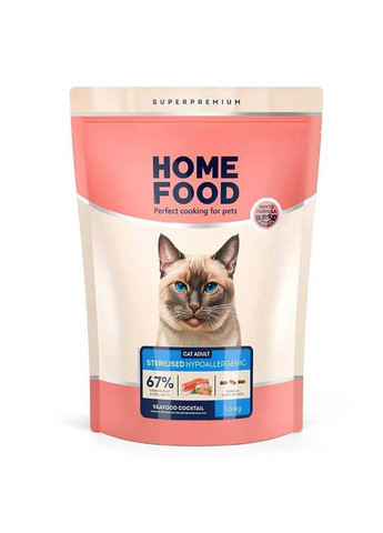 Гіпоалергенний корм Home Food завдяки своїй унікальній рецептурі має величезну кількість переваг: Корм може похвалитися високоенергетичним білковим раціоном, який повністю задовольняє організм тварини та забезпечує їй необхідну кількість поживних речовин. Ідеально підходить для вихованців з алергічними проблемами та чутливим травленням, а також для кастрованих котів і стерилізованих кішок. Вітамінний комплекс, високоякісні амінокислоти (L-метіонін, таурин, L-карнітин), а також хелатний мінеральний склад зміцнює імунітет і забезпечує чудове самопочуття улюбленця. Фітоформула АМРОЛ з біологічно активним комплексом на основі амаранту, розторопші та льону чинить потужну імуностимулюючу та протизапальну дію, нормалізує роботу шлунково-кишкового тракту й сечостатевої системи, а також запобігає виникненню проблем зі шкірою та шерстю. Пребіотик покращує мікрофлору кишківника і засвоєння поживних речовин, що своєю чергою допомагає організму впоратися з інфекціями та хворобами. Олія лосося з Омега-3 та Омега-6 жирними кислотами покращує стан шкіри та шерсті, а також відіграє важливу роль у підтримці здоров'я серця та імунної системи. Високий вміст антиоксидантів і кислот ягоди журавлини підтримує оптимальний рівень рН сечі, перешкоджаючи розмноженню шкідливих мікроорганізмів і утворенню кристалів у сечі. Протизапальні та антисептичні властивості імбиру, чебрецю та шавлії підтримують здоров'я шлунково-кишкової та сечостатевої систем. Склад: морська риба 28% (дегідратована біла морська риба 16%, свіжа морська риба (минтай, скумбрія, сайра) не менше 12%), рис цільнозерновий, зневоднений протеїн лосося 14%, зневоднений протеїн криля 7%, нут (жовтий турецький горох), жир курячий 5%, цільна креветка 5% (джерело глюкозаміну), олія лосося 4% (джерело Омега-3, Омега-6), гідролізований протеїн лосося 4%, рослинні харчові волокна, фітоформула АМРОЛ (амарант, розторопша, льон) 3%, бета-1.3/1.6-глюкани (пребіотик), мананоолігосахариди, морські водорості (ламінарія) 0.4%, інулін цикорію 0.4%, ягоди журавлини сушеної 0.2%, листя м’яти лимонної 0.1%, чебрець 0.04%, шавлія 0.04%, псиліум (оболонка насіння подорожника) 0.04%, імбир 0.02%, юка Шидигера 0.02%. Харчові добавки на 1 кг корму: вітамін A 20000 МО, вітамін D3 800 МО, вітамін Е 600 мг, вітамін C 460 мг, холіну хлорид 2100 мг, біотин 1.8 мг, вітамін В1 8 мг, вітамін В2 10 мг, вітамін В3 30 мг, вітамін В5 40 мг, вітамін В6 10 мг, В9 фолієва кислота 0.7 мг, вітамін В12 0.18 мг, цинк 160 мг, залізо 32 мг, марганець 50 мг, йодид калію 4 мг, мідь 7 мг, селен 0.2 мг, магній 0.06 мг, L-метіонін 4000 мг, таурин 2100 мг, L-карнітин 100 мг. Антиоксиданти природного походження: екстракти цитруса, чорної смородини, винограду. Гарантований аналіз: сирий білок 29%, сирий жир 14%, сира клітковина 2.8%, сира зола 6.2%, кальцій 1.0%, фосфор 0.95%, вологість 10%, Омега-3 1.1%, Омега-6 3.14%. Енергетична цінність (калорійність) 100 г корму: 1547 кДж (370 кКал). Рекомендації щодо годування: Привчайте тварину до сухого корму Home Food поступово. Зазначена денна норма є орієнтовною: точну кількість слід визначати відповідно до вимог, віку, рівня активності, погодних умов і особливих потреб тварини.У тварини завжди повинна бути миска зі свіжою, чистою водою. Зберігати в сухому прохолодному місці. Завжди закривайте упаковку після кожного годування. Норми годування вказані на упаковці корму. Вага кота, кг Добова норма корму, г 2-3 20-48 3-4 45-59 4-5 55-70 5-6 68-82 