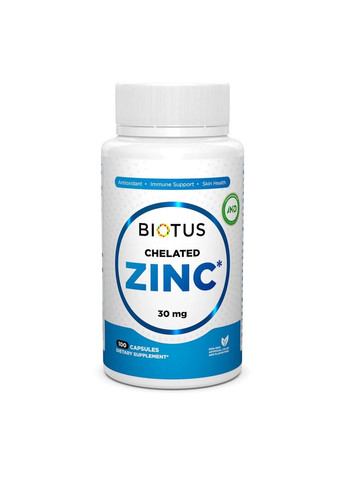 Склад Розмір порції: 1 капсула. В 1 порції міститься: цинк (цинк гліцинат) - 30 мг. Опис Цинк від українського бренду Biotus є джерелом гліцинат цинку в хелатній формі, яка легко засвоюється організмом. Цинк дуже важливий для організму, він бере участь у виконанні багатьох його функцій, серед них: зростання, розвиток і обмін речовин. Натуральний цинк, що міститься в харчовій добавці з гарбузового насіння, стимулює вироблення колагену і сприяє поліпшенню стану шкіри. Також він надає підтримку у формуванні імунітету і допомагає при лікуванні ангіни і бронхіту. Цинк має сильні антиоксидантні властивості, бере участь у формуванні ДНК, перешкоджає інфекційним захворюванням і бореться з раком. Цей мінерал важливий для синтезу білків організму і при копіюванні генетичного матеріалу (при розподілі і зростанні клітин), бере участь в утворенні інсуліну (попереджає розвиток діабету), гіпофіза і кров'яних тілець. Прийом цинку, від українського виробника, покращує роботу мозку, зір, стан волосся, нігтів, шкіри. Цинк корисний для репродуктивного здоров'я, особливо у чоловіків, підтримує здоров'я простати. Цинк прискорює загоєння ран, зміцнює кісткову систему. Цинк дуже важливий для імунної системи, він потрібен для безперебійної її роботи. БАДи не є медичними препаратами. Спосіб застосування Приймати одну капсулу в день або за вказівкою лікаря. Умови зберігання Зберігати в недоступному для дітей місці. Зберігати щільно закритим в прохолодному, сухому місці.