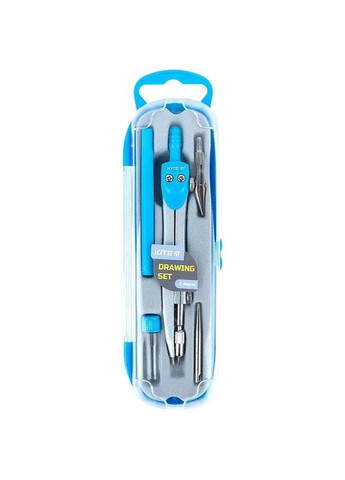 У пластиковій коробці в пластиковій коробці. У наборі циркуль, олівець, 2 грифелі та додаткова "ніжка" для циркуля, транспортир, лінійка, 2 трикутники, гумка, точилка Розмір 18х10 см