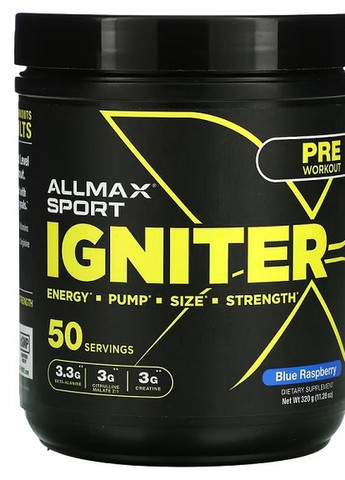 Рівень енергії Зростання м'язів Що надає сил 3,3 г бета-аланина 3 г цитруліну малат 2 : 1 3 г креатину Харчова добавка Краща наука Екстремальні тренування Чудові результати Поліпшена підтяжка шкіри + посилення накачування + інтенсивна сила = чудові результати Кожна партія перевірена в лабораторії Робиться на підприємстві, що має реєстрацію поточної належної виробничої практики (cGMP) Виведіть свої тренування на новий рівень за допомогою передтренувального засобу IGNITER. Легко змішується, смачне і містить усе необхідне для досягнення ваших цілей. Вибухова енергія - кофеїн / таурин / вітаміни групи B Насоси, що покращують стан вен - цитрулін малат / аргінін Збільшення об'єму і сили - креатин Зниження м'язової втоми - бета-аланин Використання На кожну мірну ложку налийте 120-160 мл холодної води. Оцініть переносимість за допомогою 1 мірної ложки, перш ніж намагатися знову. † Підтримуйте достатній рівень рідини. Дозування. Початківець: Розпочніть з 1 мірної ложки. Для просунутих: 3 мірних ложки - це екстремальний прийом, і їх слід приймати тільки у тому випадку, якщо ви вже зрозуміли, що таке 1 мірна ложка †. † Попередження. Не перевищуйте 3 мірних ложки в день.