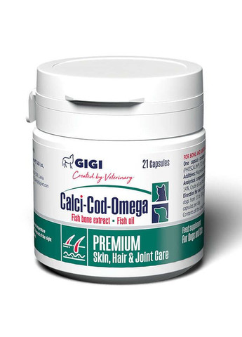 Gigi Calci-Cod-Omega - це комплексна добавка, яка призначена для якісного зміцнення та формування скелета тварини, зубів і кісток, гіалінових хрящів, що досягається завдяки унікальному збалансованому поєднанню у складі препарату кальцію, фосфору, вітаміну Д3, глюкозаміну, хондроїтину, а також ненасичених жирних кислот. Вітамінно-мінеральний комплекс за оптимальною ціною може застосовуватися як котам, так і собакам. Він підходить не тільки для дорослих вихованців, але і для цуценят та кошенят. Препарат Gigi Calci-Cod-Omega подбає про вашого домашнього улюбленця в період його інтенсивного зростання. Також добавка стане дуже корисною для підтримки здоров'я тварини під час вагітності та вирощування потомства. Вона насичує організм тварини кальцієм та фосфором, і це сприятливо позначається на стані зубів, кісткової та хрящової тканин. У молодих тварин при прийманні вітамінів правильно формується скелет. Для літніх котів і собак, а також для тих, хто отримав травму кісток, добавка також надасть неоціненну допомогу Особливості та переваги : ефективний при шкірних захворюваннях (хронічних, гострих, алергічних дерматитах тощо); допомагає при захворюваннях кісток; для профілактики вікового остеопорозу у літніх котів та собак; надає шкірі еластичність, а шерсті – гарний, здоровий блиск; препарат має легкий, рибний запах, який приваблює котів та собак; не містить ГМО, гормонів, медикаментів і штучних барвників; не оброблений радіаційним та мікрохвильовим опроміненням; випускається у формі зручних капсул з желатиновою оболонкою; легко поїдається навіть вибагливими вихованцями; всі компоненти препарату добре всмоктуються в шлунково-кишковому тракті. Показання до застосування : при захворюваннях шкіри для котів і собак: гострих та хронічних алергічних дерматитів, захворюваннях кісток, спричинених нестачею кальцію, фосфору. Склад : порошок з олії печінки тріски (Q2P Cod Liver oil powder 50%) – натуральне джерело Омега-3; гідролізований порошок риб'ячих кісток (PHOSCALIM®) – натуральне джерело кальцію, фосфору, сульфату хондроїтину та глюкозаміну. Характерні параметри: жир – 26%, вітамін Л – 1154 ІЕ (1 капсула), протеїн – 12%, вітамін D3 – 112 ІЕ (1 капсула), кальцій – 14%, фосфор – 7%. Рекомендоване дозування та спосіб застосування : Котам та собакам до 10 кг приймати по 1 капсулі на день; собакам від 10 до 30 кг – по 2 капсули на день; собакам понад 30 кг – по 3 капсули на день. Допускається змішування вмісту капсули з їжею тварини Фасування : 21 шт./уп., 90 шт./уп.