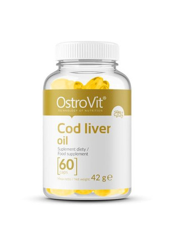 Харчова добавка OstroVit-Cod Liver Oil - це дієтична добавка в капсулах, що містить в своєму складі печінкове масло Атлантичної тріски, збагачене вітамінами А і D. Добавка є джерелом незамінних жирних кислот омега-3 (в основному ЕПК і ДГК), які, безсумнівно, необхідні в нашому раціоні для правильного функціонування багатьох життєво важливих механізмів, таких як нервова і серцево-судинна системи і скелет. Масло печінки тріски також є багатством вітамінів А і D, які покращують роботу нашої імунної системи (імунної), незамінні в боротьбі з токсинами і мікроорганізмами. Добавка призначена до вживання спортсменами і людьми, які прагнуть заповнити нестачу ненасичених жирних кислот омега-3 в організмі. Результати застосування: Підтримка нормальної роботи серця Стабілізація кров'яного тиску Посилення природного захисту організму Нормалізація складу крові Зменшення тромбоутворення Підтримка роботи мозку Підвищення пружності та еластичності суглобів, зв'язок, хрящів Зниження запальних процесів Підвищення загального енергетичного потенціалу і тонусу Зниження рівня "поганого" холестерину Поліпшення стану шкіри, волосся, нігтів Склад 1 порції (1 капсула) OstroVit-Cod Liver Oil: Масло з печінки тріски – риба) - 500 мг Ретинол (вітамін А) - 375 мкг Холекальциферол – вітамін D) - 3.38 мкг Інші інгредієнти: Желатин, гліцерин( зволожувач), очищена вода, Продукт може містити молоко (включаючи лактозу), сою, арахіс, інші горіхи, насіння кунжуту, овес, яйця, Ракоподібні. Рекомендації по вживанню: 1 порція (1 капсула) в день. Попередження: Не використовувати, якщо у вас алергія на будь-яке із сполук. Не перевищувати рекомендовану добову дозу. Зберігати в недоступному для дітей місці. Захищати від прямих сонячних променів і зберігати в сухому прохолодному місці.