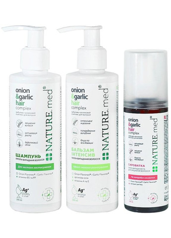 Опис Набір №2 "Догляд за волоссям" Склад набору: шампунь «Цибуляно-часниковий комплекс для волосся» NATURE.med, 200 мл + бальзам «Цибуляно-часниковий комплекс для волосся. Бальзам-інтенсив» NATURE.med, 200 мл + тонік косметичний «Цибуляно-часниковий комплекс для волосся. Сироватка» NATURE.med, 100 мл. Цей набір від бренда NATURE.med зібрав у собі косметику для волосся, яка забезпечить здоров'я шкіри голови і зможе зміцнити ваші локони. Ключовим компонентом кожного продукту став цибуляно-часниковий комплекс, який забезпечує інтенсивну дію та швидке відновлення. Волосся набуде гладкості, пружності і густоти. Кожен продукт має оздоровлювальну дію та допомагає вирішити безліч проблем, таких як ламкість, посічені кінчики, сухість і випадання. Шампунь «Цибуляно-часниковий комплекс для волосся» NATURE.med - очищає шкірний покрив від забруднень, себуму та залишку стайлінгових засобів;- забезпечує профілактику випадання волосся;- перешкоджає появі себуму;- формула збагачена вітамінами В5 та PP, а також гідратами протеїнів пшениці;- дарує відчуття чистоти й свіжості;- має приємний і освіжальний аромат запашних квітів;- підготує волосся до подальших процедур. Бальзам «Цибуляно-часниковий комплекс для волосся» NATURE.med - інтенсивно живить і зволожує волосся по всій довжині;- зміцнює пасма та шкірний покрив, підвищуючи бар'єрні властивості;- забезпечує тривале відчуття чистоти й свіжості;- дарує чарівний аромат квітів;- формула на основі екстракту цибулі, арганової олії, а також вітамінів А та Е;- діє як антиоксидант;- запобігає появі ламкості та посічених кінчиків;- запечатує лусочки, розгладжуючи волосся. Тонік косметичний «Цибуляно-часниковий комплекс для волосся. Сироватка» NATURE.med - легко наноситься за рахунок якісного дозатора;- містить у складі екстракти цибулі та часнику, а також реп'яха;- тонізує та зволожує волосся, насичуючи корисними мікроелементами;- не вимагає змивання водою;- освіжає та залишає на волоссі чарівний аромат квітів;- підійде для щоденного використання;- спрощує процеси розчісування та укладання;- запобігає появі заплутаних пасом. Спосіб застосування Шампунь «Цибуляно-часниковий комплекс для волосся» NATURE.med Рівномірно нанести шампунь на вологе волосся, масажними рухами спінити і ретельно змити теплою водою. За потреби повторити. Бальзам «Цибуляно-часниковий комплекс для волосся. Бальзам-інтенсив» NATURE.med Ефективне використання бальзаму можливе 2 способами: - регулярно після миття волосся як зміцнювальний бальзам по всій довжині волосся. Нанести бальзам на чисте вологе волосся, рівномірно розподілити по всій довжині. Для максимального ефекту рекомендується потримати бальзам на волоссі 3-5 хвилин, потім змити водою. - 1-2 рази на тиждень – перед миттям волосся, як зміцнювальну маску на корені. Нанести бальзам на волосся і шкіру голови масажними рухами, рівномірно розподілити по всій довжині, потримати на волоссі 15-20 хвилин, потім змити шампунем. Тонік косметичний «Цибуляно-часниковий комплекс для волосся. Сироватка» NATURE.med Нанести сироватку на корені сухого або помірно вологого волосся і шкіру голови, втерти легкими рухами. Не змивати! За необхідності розподілити сироватку по всій довжині волосся. Залежно від ступеня випадання волосся наносити: при інтенсивному випаданні – 1-2 рази на день; для профілактики – 1 раз на два дні. Склад Shampoo "Onion-garlic comp