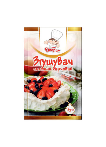 Забезпечує високу стабільність та в'язкість продуктів на основі сметани або вершків: кремів, десертів, морозива, а також майонезів та інших соусів. Спосіб використання: 12 г згущувача харчового всипати в 400 г сметани, вершків або іншої основи, збивати міксером протягом 3-5 хвилин. Склад: згущувач: крохмаль модифікований Е1414 (66 %), пудра цукрова. Поживна (харчова) цінність на 100 g (г) продукту: білки - 0,4 g (г), жири - 0,2 g (г), вуглеводи - 97,6 g (г). Енергетична цінність (калорійність) на 100 g (г) продукту: 1450 кJ (кДж) (350 ксаl (ккал)). Умови зберігання: зберігати в сухих, чистих приміщеннях, за температури не вище ніж 25 °С та відносної вологості повітря не більше ніж 75 %.