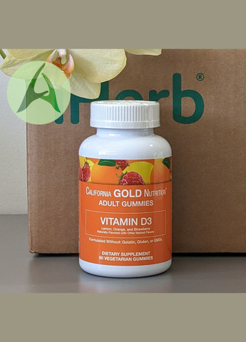 California Gold Nutrition, жувальні таблетки з вітаміном D3, лимон, апельсин і полуниця, 2000 МО, 90 жувальних мармеладок (1000 МО в 1 жувальній цукерці) Опис Жувальні таблетки з вітаміном D3 California Gold Nutrition® Смачна щоденна порція вітаміну D3 Натуральні ароматизатори: лимон, апельсин і полуниця Підтримка здоров’я кісток та імунітету* Підходить для вегетаріанців Не містить желатину, глютену, ГМО та сої Виготовлено на підприємстві, яке має реєстрацію сучасної належної виробничої практики (cGMP) і проходить незалежні перевірки Гарантія 100 % Gold Guarantee Вітамін D — це важлива поживна речовина, яка необхідна організму щодня. Жувальні таблетки з вітаміном D3 від California Gold Nutrition — це цікавий і зручний спосіб отримати щоденну дозу вітаміну D, який може допомогти підтримувати здоров’я кісток та імунітет*. Переваги вітаміну D3 Вітамін D3 — це улюблена форма вітаміну D в організмі. Вітамін D, який іноді називають «сонячним вітаміном», оскільки він виробляється в шкірі під впливом сонячного світла, є важливим вітаміном для багатьох метаболічних процесів в організмі. Він допомагає регулювати засвоєння кальцію та фосфору, що може допомогти підтримувати здоров’я кісток*. Крім того, вітамін D підтримує нормальну роботу імунної системи*. Жувальні таблетки з вітаміном D3 від California Gold Nutritionмістять щоденну дозу вітаміну D3 в зручних жувальних таблетках. Вони не містять желатину й глютену, а також мають натуральний смак лимона, апельсина й полуниці. Це чудовий спосіб додати вітамін D у свій раціон дорослим і дітям. Рекомендації із застосування Застосування. Приймати по 1 жувальній мармеладці на день, незалежно від прийому їжі. Бажано приймати відповідно до рекомендацій кваліфікованого медичного працівника. Інші інгредієнти Основні інгредієнти Вітамін D (у вигляді вітаміну D3, холекальциферолу) Інші інгредієнти Тростинний цукор, глюкозний сироп (з тапіоки), очищена вода, цитрусовий пектин, лимонна кислота, адипінова кислота, цитрат натрію, натуральні ароматизатори, антоціан з екстракту чорної моркви (барвник), бета-каротин (барвник), олеорезин куркуми (барвник), мальтодекстрин, модифікований рослинний крохмаль, кукурудзяна олія. Поживна цінність Розмір порції: 2 жувальні мармеладки Порцій в упаковці: 45 Кількість в 1 порції % від добової норми для дорослих і дітей старше 4 років* Калорії 14 Усього вуглеводів 4 г 1 % Усього цукру 3 г † Містить 3 г доданого цукру 6 % Вітамін D3 (у вигляді холекальциферолу) 50 мкг (2000 МО) 250 % Натрій 3 мг < 1 % * Відсоток від добової норми за умови споживання 2000 калорій на день. † Добову норму не визначено.