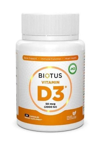 Vitamin D3 від українського бренду Biotus - це жиророзчинний вітамін, який необхідний для організму в будь-якому віці. Вітамін Д3 надає підтримку здоров'ю кісток, серцево-судинної, нервово-м'язової та імунної системи. Для нормальної роботи організму вітамін Д важливий і повинен надходити в організм кожен день. Цей жиророзчинний вітамін потрібен для кращого засвоєння кальцію, бере участь в мінералізації і процесі росту скелета. Вітамін Д3 попереджає слабкість м'язів, покращує тонус м'язів, зміцнює імунну систему, сприяє згортанню крові. За допомогою цього вітаміну внутрішні органи функціонують нормально, поліпшується робота щитовидної залози. Вітамін бере участь в регуляції артеріального тиску, стабілізує серцебиття, знижує сприйнятливість до захворювань серця і шкіри. Також потреба у вітаміні Д зростає у жінок під час менопаузи і людей в похилому віці. У терапевтичних цілях вітамін Д3 приймається при лікуванні атеросклерозу. Рекомендоване застосування: В якості харчової добавки приймати 1 капсулу в день або за призначенням лікаря. Не містить: Глютен, ГМО. Попередження: Зберігайте в недоступному для дітей місці. Зберігати в прохолодному, сухому місці, далеко від джерел тепла і світла. Якщо ви вагітні або годуєте грудьми, проконсультуйтеся з лікарем перед використанням цього продукту.