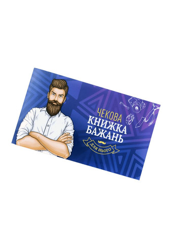 Є речі, що не купиш за гроші. Це Любов і Увага – найцінніше, що у нас є. Даруючи Чекову Книжку Бажань – ви даруєте вашій половинці саме ці безцінні речі Любов і Увагу. З цим подарунком ви зобов'язуєтеся виконати 12 простих, але водночас дуже приємних «квестів» - бажань вашої будь-якої половинки. Чекова Книга Бажанів: для Нього - це безумовно яскравий і оригінальний подарунок, який обов'язково порадує будь-якого хлопця. Як користуватися Чекової Книжкою Бажань: 1. Ваш чоловік, який став власником цієї Чекової Книжки, вибирає чек, відриває і пред'являє його Дарувальнику, тобто Вам до виконання. 2. Тепер Вам необхідно виконати обране бажання, а йому залишається лише насолоджуватися його виконанням. 3. Після того, як бажання виконано, йому необхідно поставити відмітки на корінці чека. 4. Чеки є одноразовими, можуть бути використані в будь-якому порядку, але не більше одного разу на день. 5. Власником даної чекової книжки є ПІБ Включає такі бажання: 1. Романтична вечеря з продовженням. 2. Прощення будь-якої однієї образи. 3. Закоханий завтрак у ліжко. 4. Виконання будь-якої примхи за бажанням. 5. Давай кохатись! 6. Кулінарний шедевр спеціально для мене. 7. 30-ти хвилинний сеанс масажу. 8. Мінімум 10 компліментів протягом дня. 9. У баню кіно рибалку футбол з друзями. 10. Мій день. Організуєш і втілюєш культурну програму з ранку і до вечора. 11. Вихідний без домашніх справ. 12. Потерти мені спинку під час душу. Штрих код: 4820245710092