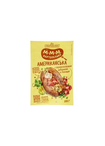 Склад: сіль харчова, часник сушений подрібнений, цибуля карамелізована різана (12%), цибуля порей подрібнена, крохмаль кукурудзяний, перець чорний мелений, натуральнi ароматизатори, бекон копчений пластівці (0.01%). ЩО ВАМ ПОТРІБНО: Картопля, середнього розміру в шкірці, ретельно вимита 4 шт. Оливкова олія 3 ст. л. Приправа до картоплі та овочів Американська з карамелізованою цибулькою та беконом від ТМ «Приправка» 1 ст. л. Рецепт: 1. Зробіть неглибокий повздовжній розріз посередині картоплі. 2. Змастіть картоплю з усіх боків оливковою олією. 3. Викладіть картоплю на деко, застелене пергаментом чи змащене олією. 4. Випікайте до м’якості та хрусткої скоринки при 200 °C 40-60 хв. Час випікання залежить від розмірів картоплі та потужності вашої духовки. 5. Дістаньте картоплю з духовки, обережно розкрийте серединку в області розрізу виделкою чи ножем, і додайте до серединки приправу за смаком, а зверху шматочки масла. Поставте в духовку аби розтопити масло.