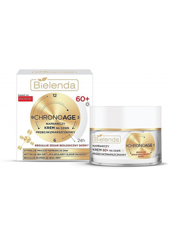 Благородне золото у складі відновлювального денного крему від бренда Bielenda допоможе омолодити шкіру обличчя, зробити її здоровою та сяйною. Крем збагачений 24-каратним колоїдним золотом. Воно зміцнює стінки капілярів, стимулює регенерацію шкіри, активізує синтез колагену. Пептиди прискорюють клітинний метаболізм. Завдяки цьому клітини одержують більше живлення, підвищується еластичність шкіри, вона буквально оживає — зменшуються зморшки та порушення овалу обличчя. Особливості Bielenda Chrono Age 24H Repairing Anti-Wrinkle Day Cream: - помітно підтягує, допомагає створити гарний овал обличчя;- розгладжує зморшки та запобігає утворенню нових;- ефективно зволожує тонку, суху шкіру;- є гарною базою під макіяж;- натуральні компоненти крему — муцин равлика, олії чіа та макадамії допомагають впоратися з віковими особливостями шкіри;- робить обличчя помітно молодшим;- стимулює вироблення колагену;- створений спеціально для догляду за зрілою шкірою 60+.