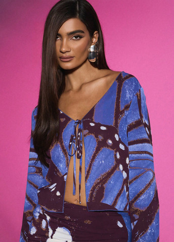 Цей укорочений топ із довгими рукавами прикрашений принтом у вигляді крил метелика. Виріз горловини у формі серця та розкльошені рукави. Асиметричний поділ додає нотку богемного стилю. Топ виконаний із поліестерової тканини. Він призначений для повсякденного носіння. Підходить для виступів на сцені та фестивалів, таких як День мертвих. Машинне прання з м'яким миючим засобом; не піддавати хімчистці.