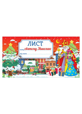 6 грудня Україна святкує День святого Миколая- це улюблене свято не тільки для усієї малечі, а й для дорослих. Кожен, прокинувшись вранці мріє знайти під подушкою бажаний подарунок. Та щоб святий Миколай завітав саме до твоєї домівки й винагородив тебе за усі добрі справи, необхідно написати йому листа. Тож хутчіше бери цей яскравий лист і заповни по готовому шаблону розділи: «Мене звати…» «Цього року я зробив багато добрих справ…», «Мені дуже подобається займатися..» «Наступного року я хочу навчитися…» Я дуже хочу отримати в подарунок…» Готовий лист, з легкістю перетворюємо у зручний святковий конверт і розміщуємо на видному місці й… очікуємо подарунок, на який заслуговуємо. Святковий конверт-лист надрукований на цупкому якісному картоні. Має ламіноване покриття, з блискітками на лицьовій стороні. На внутрішній стороні конверту – лист святому Миколаю. Формат: 20х10,5 см. У розгорнутому вигляді - А4 формат (29х20 см).