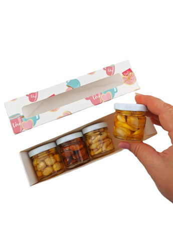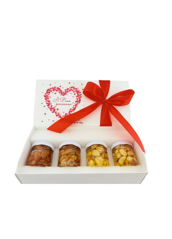 Подарунковий набір, у коробочці розміром 20*5*5 см, з подарунковою наклейкою до свята, і прикрашений атласною стрічкою. У наборі: - 50 г фундук у меду; - 50 г кеш'ю в меду; - 50 г арахіс у меду; - 50 г мигдаль у меду. Ми можемо запакувати цей набір з наклейками, до таких свят: День учителя День Вихователя День Захисника України День закоханих Новий рік 8 березня День Святого Миколая День народження І на будь-яке свято. При корпоративному замовленні розробляємо наклейку з логотипом компанії.