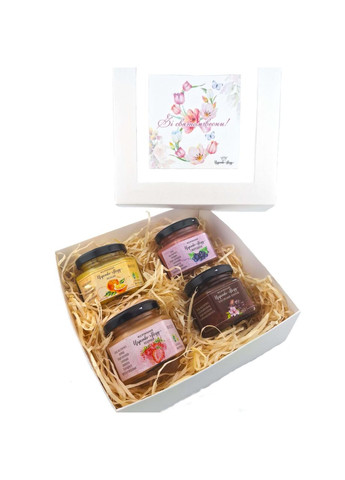 Подарунковий набір у картонній коробочці розміром 18*18 см, з наклейкою до 8 березня, і прикрашений атласною стрічкою. У наборі: 130 г крем мед полуниця 130 г крем мед смородина 130 г крем мед шоколад 130 г крем мед апельсин До цього набору є наклейки на такі свята: День Вчителя День Вихователя День захисника України День закоханих Новий Рік 8 березня День Святого Миколая І на будь-яке свято. При корпоративному замовленні розробляємо наклейку з логотипом компанії.