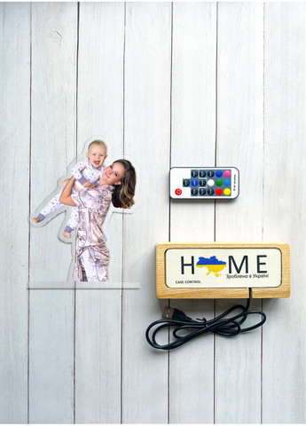Акриловий нічник з вашою фігурною фотографією, картинкою або логотипом. Вдень використовуєте як фоторамку на стильній дерев'яній підставці з масиву дуба, вечором маєте додатково нічничок-світильник з приємним розсіяним світлом. Фото-світильник легко підключити через USB роз’єм до повербанку, телефонного блоку живлення, ноутбука тощо. Фігурне фото виконане якісними фарбами, які не бояться часу і не вицвітають. Пластину з фотографією можна легко виймати і замінити на іншу (робіть замовлення на декілька фотографій, можливе дозамовлення додаткових фото). Підсвітку фотографії можна змінювати (через дистанційний пульт керування) колір та інтенсивність освітлення (5 рівнів інтенсивності), можна задати режими блимання (10 рівнів швидкості) тощо. Характеристики фоторамки: 22 колірні режими роботи; 5 рівнів яскравості; 10 рівнів швидкості блимання; робоча напруга: 5 V радіус дії дистанційного керування: понад 6 м на відкритій ділянці довжина USB-кабеля: 0,95 м ультратонкий дизайн Комплектація: фігурна акрилова пластина з фото (розміри в межах 15х20 см, виріз по контурах фото, товщина пластини 3 мм) - 1 шт.; дерев'яна основа (масив, лакована): 15х6х2,5 см - 1 шт.; умонтовані в підставку: стрічка LED- RGB 5050 (6 діодів) та LED-контролер; пульт ДУ (на 17 кнопок) з батарейкою - 1 шт. Увага! Блок живлення не входить до комплектації фоторамки з підсвіткою. Підходить будь-який блок живлення від мобільного телефону (на 5В).
