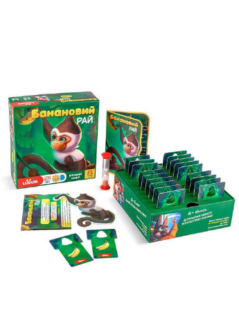 Ігровий набір унікального формату: гра-чіпляння для 2 гравців + розповідь + аудіоказка. Розрахований на дітей віком 2-5 років. Малюкам належить разом із мавпочкою збирати банані, вважати їх, бути дуже поважним і не схопити бананову шкірку. Пісочний час допоможе у змаганнях на швидкість. Комплектація: ложемент, двосторонні картки із зображенням бананів (20 шт.), мавпа, листівка з розповіддю, пісочний годинник, інструкція, посилання на аудіоказки. Розмір коробки: 20 х 20 х 6,8 см Країна реєстрації бренду: Україна; Виробник: Ludum; Доставка: Відправлення протягом 1-2 робочих днів; Бренд: Ludum; Країна-виробник товару: Україна; Габарити: ширина: 20; Габарити: висота: 20; Габарити: Довжина: 6.8; Вага товару: 0; Вид: Розвиваючі; Вік: Від 2-х років; Матеріал: комбінований; Тип: Настільна гра; Торгова марка: Ludum; Колір: Різні кольори; Стать: Унісекс; Упаковка: картонна коробка; Вікова група: Від 2 років