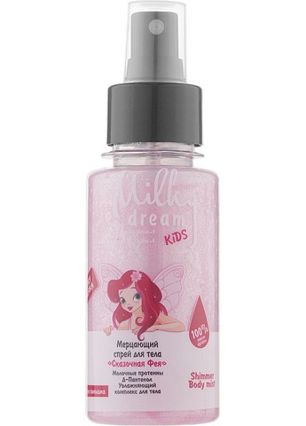 Що вам нагадує ваш особистий календар? Сьогодні час для дитячого свята? Завдяки цьому мерехтливому спрею від бренда Milky Dream у вашої дитини точно буде святковий настрій, незалежно від пори року, погоди й інших факторів. Продукт є абсолютно безпечним і може використовуватися навіть маленькими дітьми. Ваша дівчинка зможе експериментувати з образами, поринаючи в атмосферу казки. Засіб максимально простий у використанні, а яскравий дизайн флакону створює додатковий антураж. Досить просто зробити «пшик» – і веселощі вже почалися! Особливості спрею для тіла «Казкова фея» від Milky Dream: - дерматологічно протестований;- на основі 100% натуральної олії аргани;- збагачений молочними протеїнами та Д-пантенолом;- справляє корисний вплив на шкіру;- включає спеціальний зволожувальний комплекс;- є джерелом свіжості, тому буде максимально актуальним у спекотний період року;- гарантує ефект фантастичного мерехтіння;- яскравий фруктовий аромат дарує сонячний настрій.