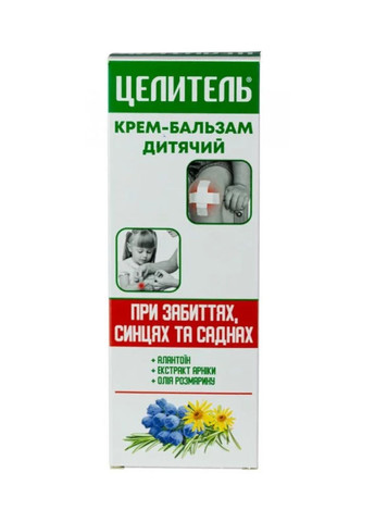 Призначення для швидкого і ефективного загоєння шкіри при ударах, подряпинах та інших пошкодженнях шкіри дитини. Особливості засобу Миттєво знімає біль; Має бактерицидну і ранозагоювальну дію; Розсмоктує синці; Знімає набряки; Прискорює регенерацію пошкодженої шкіри; Утворює м'яку захисну плівку. Продукт не містить синтетичних барвників і ароматизаторів. Спосіб застосування При пошкодженнях шкіри негайно нанести бальзам на місце пошкодження і рівномірно розподілити легкими рухами. Склад Олія соняшникова, екстракт арніки, β-каротин, алантоїн, масло ефірне ялівцю, масло ефірне розмарину, ментол.