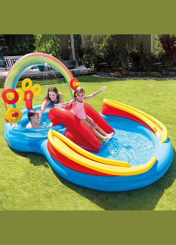 Надувний дитячий ігровий центр Intex 57453 Rainbow Pool - міні-аквапарк у Вас вдома, який обов'язково сподобається Вашому малюку. Ігровий центр призначений для активних ігор одного або двох дітей віком від 3 до 6 років. Центр має два окремі басейни, сполучені чудовою гіркою. Також в комплект входять м'ячі та надувні кільця, даючи величезний простір для дитячої фантазії та ігор. Діти можуть з'їхати з гірки прямо у воду або поплескати в басейні під душем. Насос у подарунок! Розміри в надутому стані: 297 х 193 х 135 см. Високі борти для додаткової безпеки. Від 2-х років.