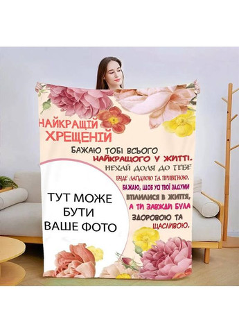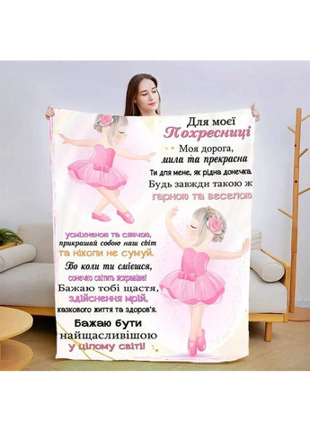 Персоналізований плед Для моєї похресниці якісне покривало з 3D малюнком 80х100 Матеріал: плюшевий велюр; щільність 260 г Малюнок наноситься способом сублімації на білу основу. Усі барвники фірмові Epson чітке зображення, не змивається. - Загадкова м'якість і неперевершений комфорт — ось що ви знайдете в наших плюшевих ковдрах із різноманітними принтами. - Покривала виготовлені з високоякісного матеріалу, який ніжно прасує вашу шкіру та забезпечує незабутній дотик. - Кожна ковдра має унікальний принт, що надає естетичний шарм вашому інтер'єру та виражає вашу індивідуальність. Ми використовуємо тільки якісний друк. Переваги якісного друку на плюшевому ковдрі безперечні. Ось деякі з них: 1 Реалістичність: Вишуканість деталей і відтворення кольорів роблять зображення на ковдрі надзвичайно реалістичними. 2 Текстурна тканина: Плюшева надає зображенню додаткову глибину та текстурність. 3 Довговічність: Високоякісний друк на плюшевому ковдрі забезпечує його довговічність і стійкість до прання. Ви можете насолоджуватися якістю зображення впродовж тривалого часу без втрат. 4 Естетики та індивідуальність: Завдяки якісному друку на плюшевому ковдрі ви можете створити унікальний декор для вашого простору.