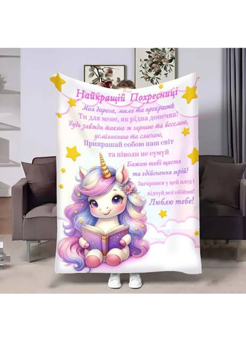 Персоналізований плед Маленькій похресниці якісне покривало з 3D малюнком 80х100 Матеріал: плюшевий велюр; щільність 260 г Малюнок наноситься способом сублімації на білу основу. Усі барвники фірмові Epson чітке зображення, не змивається. - Загадкова м'якість і неперевершений комфорт — ось що ви знайдете в наших плюшевих ковдрах із різноманітними принтами. - Покривала виготовлені з високоякісного матеріалу, який ніжно прасує вашу шкіру та забезпечує незабутній дотик. - Кожна ковдра має унікальний принт, що надає естетичний шарм вашому інтер'єру та виражає вашу індивідуальність. Ми використовуємо тільки якісний друк. Переваги якісного друку на плюшевому ковдрі безперечні. Ось деякі з них: 1 Реалістичність: Вишуканість деталей і відтворення кольорів роблять зображення на ковдрі надзвичайно реалістичними. 2 Текстурна тканина: Плюшева надає зображенню додаткову глибину та текстурність. 3 Довговічність: Високоякісний друк на плюшевому ковдрі забезпечує його довговічність і стійкість до прання. Ви можете насолоджуватися якістю зображення впродовж тривалого часу без втрат. 4 Естетики та індивідуальність: Завдяки якісному друку на плюшевому ковдрі ви можете створити унікальний декор для вашого простору.
