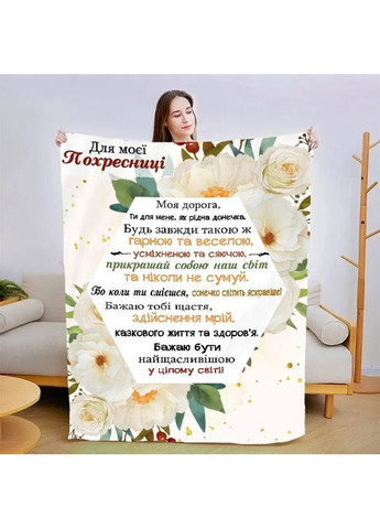 Персоналізований плед Моїй похресниці якісне покривало з 3D малюнком 160х200 Матеріал: плюшевий велюр; щільність 260 г Малюнок наноситься способом сублімації на білу основу. Усі барвники фірмові Epson чітке зображення, не змивається. - Загадкова м'якість і неперевершений комфорт — ось що ви знайдете в наших плюшевих ковдрах із різноманітними принтами. - Покривала виготовлені з високоякісного матеріалу, який ніжно прасує вашу шкіру та забезпечує незабутній дотик. - Кожна ковдра має унікальний принт, що надає естетичний шарм вашому інтер'єру та виражає вашу індивідуальність. Ми використовуємо тільки якісний друк. Переваги якісного друку на плюшевому ковдрі безперечні. Ось деякі з них: 1 Реалістичність: Вишуканість деталей і відтворення кольорів роблять зображення на ковдрі надзвичайно реалістичними. 2 Текстурна тканина: Плюшева надає зображенню додаткову глибину та текстурність. 3 Довговічність: Високоякісний друк на плюшевому ковдрі забезпечує його довговічність і стійкість до прання. Ви можете насолоджуватися якістю зображення впродовж тривалого часу без втрат. 4 Естетики та індивідуальність: Завдяки якісному друку на плюшевому ковдрі ви можете створити унікальний декор для вашого простору.