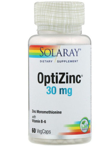 Біодобавка ОптіЦінк (OptiZinc) - підтримує нормальну роботу імунної та ендокринної систем, шкіри і клітин. Це запатентований комплекс цинку і метіоніну (амінокислоти, яка найкраще засвоюється організмом) в співвідношенні 1: 1. Відомо, що цинк важливий в синтезі білків організму і при копіюванні генетичного матеріалу, коли клітини діляться і ростуть, бере участь в утворенні інсуліну, гіпофіза і кров'яних тілець. Дефіцит цинку може викликати порушення статевих функцій, викликати передчасне старіння, можливий розвиток енцефалопатії. Найчастіше від нестачі цинку страждають вегетаріанці і люди зі шкідливими звичками. Також лікарі рекомендують вживати цинк під час прийому протизаплідних засобів, оскільки в цей період його кількість знижується. Дослідження показують, що OptiZinc краще засвоюється і довше зберігається в організмі оп порівнянні зі звичайними добавками цинку, які беруть участь в дослідженні, і не з'єднується з харчовою клітковиною і фітати, які перешкоджають всмоктуванню цинку. Вітамін В6 бере участь в обміні речовин, засвоєнні ненасичених жирних кислот, нормалізації обміну холестерину. Бере участь в процесі кровотворення: синтезі еритроцитів, гемоглобіну, що запобігає розвитку анемій. Також підтримує роботу серцево-судинної системи, запобігає тромб освіту, розвитку атеросклерозу, інфаркту, інсульту, нормалізує тиск. Вітамін В6 зміцнює імунітет, збільшуючи вироблення антитіл. Застосування: Приймайте по 1 капсулі в день під час їжі або запиваючи склянкою води. Протипоказання: Індивідуальна непереносимість компонентів. Попередження: При вагітності, годуванні груддю, прийом будь-яких медичних препаратів або наявності будь-яких захворювань слід проконсультуватися з лікарем перед вживанням будь-яких харчових добавок. У разі виникнення будь-яких побічних реакцій припиніть використання і проконсультуйтеся з лікарем. Зберігати в недоступному для дітей місці. Не застосовувати препарат, якщо зовнішня захисна мембрана відсутня або пошкоджена.