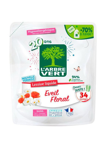 Рідкий засіб для прання L'Arbre Vert (Л'Арбре Верт) Аромат квітів - це ефективний засіб для прання, який забезпечує відмінні результати у видаленні бруду і плям, залишаючи вашу білизну свіжою та чистою. Основні переваги: формула має нейтральний PH для шкіри та призначений для мінімізації ризику виникнення алергії - гіпоалергенна не тестується на тваринах і не містить речовин тваринного походження без парабенів, барвників, ізотіазолінону або його похідних, без метилізотіазолінону (MIT) 100% перероблюваної упаковки екологічні компоненти засобу не забруднюють стічні води та септики Спосіб застосування: нанесіть засіб безпосередньо на поверхню, яку ви хочете почистити, з розрахунку 35 мл на 5 л води (один ковпачок). Залиште засіб діяти на кілька секунд, ретельно промийте водою. Поверхні, які перебувають у контакті з харчовими продуктами, слід обов'язково обполоснути питною водою. Характеристики Об'єм: 1.53 л Виробник: L'Arbre Vert, Франція.