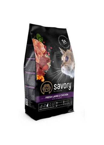 Корм класу холістик для дорослих котів з чутливим травленням.Повнораціонний сухий корм для котів Savory пробудить у вашого улюбленця ту життєву енергію, про яку він навіть сам ще не знав. Ексклюзивна рецептура корму була розроблена досвідченими європейськими спеціалістами з харчування домашніх улюбленців. Використовуючи холістичний підхід, вдалося створити біологічно відповідний, здоровий раціон для котів, який є корисним і смачним настільки, що лапки оближеш. Поєднання добірних натуральних інгредієнтів дає можливість піклуватися про здоров’я чотирилапого, а вишуканий смак – дарувати йому насолоду від щоденного споживання корму Savory. Сухий корм для котів Savory містить свіже м'ясо ягняти та дегідратоване м'ясо індички, ягоди, фрукти та овочі. Ці компоненти створені природою, щоб котик зміг втамувати голод, отримавши необхідні поживні речовини без ризику виникнення алергії. Переваги: Свіже м'ясо ягняти та дегідратоване м'ясо індички – цінне джерело гіпоалергенних білків, які легко засвоюються та надають корму неперевершеного смаку. Унікальний комплекс пребіотиків, пробіотиків і мінералів підтримує здорове травлення та зміцнює імунітет. Підтримання оптимальної ваги – рівномірний набір м’язової маси без відкладання жиру. Суперфуди для гармонійного розвитку та комфорту травлення. Містить хондропротектори для здорового формування, зміцнення та захисту суглобів. Ягоди, фрукти і овочі – джерело антиоксидантів, вітамінів і флавоноїдів для довгого та здорового життя котика. Не містить штучних барвників і штучних ароматизаторів – підхід «NafNac». Особливості: Ягня є найбільш гіпоалергенним та ніжним джерелом білка, легко засвоюється організмом. Не містить холестерину, багате на вітаміни, мікроелементи та лецитин. Індичка - джерело цінного високобілкового м`яса, що містить велику кількість мінералів (селен, цинк, натрій, фосфор, магній, калій) та вітамінів (В3, В6, В12). Зелений горох і рис. Білок зеленого гороху містить амінокислоти: метіонін, цистин, триптофан; має низький глікемічний індекс. У поєднанні з корисними цільнозерновими злаками (рисом) засвоєння такого протеїну відбувається максимально ефективно. Гарбуз - цінний дієтичний продукт, натуральне джерело корисної для кишківника клітковини, вітамінів і мінеральних речовин. Сушений антарктичний криль - натуральне джерело ейкозапентаєнової та докозагексаєнової кислот, необхідних для гострого зору, нормального функціонування мозку й здорової шкіри і шерсті. Сушена лохина – природний антиоксидант для боротьби з вільними радикалами, захисту і відновлення клітин організму. Сушена журавлина містить антиоксиданти і біофлавоноїди для профілактики розвитку шкідливої мікрофлори в сечовидільній системі. Ці ягоди підтримують здоров'я сечовивідних шляхів, регулюють кислотність сечі і є хорошим кишковим антисептиком. Яблука є джерелом пребіотиків (олігосахаридів), що покращують здоров'я мікрофлори кишечника. Шпинат – джерело вітамінів групи В. Знижує процеси окислення в організмі, нормалізує артеріальний тиск. Корм Savory – корисне може бути смачним! Склад: свіже ягня (15,5%), дегідратована індичка (15%), зелений горошок, коричневий рис, білий рис, гідролізований протеїн тваринного походження (6%), жир тваринного походження (курка, 5,5%), дегідратована курка (5% ), сушений буряк, лососев