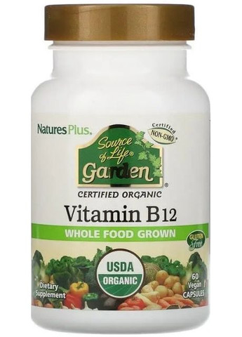 Органічний вітамін B12 - аліментарна підтримка, що надає енергію та життєві сили, який сприяє хорошій роботі серцево-судинної системи та покращує самопочуття. Виробник: Nature's Plus, США Форма випуску: 60 веганських капсул Вік: від 18 років Склад: Компонент Склад 2 капсул Тіамін (із сертифікованих органічних гуава [Psidium guajava], витримки зі святого Василя [Ocimum sanctum] та лимона [Citrus limon]) 1 мг Рибофлавін (від сертифікованого органічного Екстракт Гуави, Священного Василя та Лимона) 0,9 мг Ніацин (від сертифікованого органічного Екстракт Гуави, Священного Василя та Лимона) 2,5 мг Вітамін B6 (від сертифікованого органічного Екстракт Гуави, Священного Василя та Лимона) 1 мг Фолієва кислота (від сертифікованих органічних речовин Екстракт Гуави, Священного Василя та Лимона) 80 мкг Вітамін B12 (з метилкобаламіну) 1000 мкг Біотин 60 мкг Пантотенова кислота (із сертифікованих екстрактів Органічної гуави, святого базиліка та лимона) 1,8 мг Сертифікована органічна суміш усієї їжі 450 мг Склад сертифікованої органічної суміші всієї їжі: Гуава, Екстракт Василія (Базилік священний), Лимон, Браун Райс, Яблуко, Помаранчевий, Виноградник, Чорниця, Полуниця, Журавлина, Свекс, Blackberry, Чорна смородина, Черрі, Граната, малина, морквяний сік, червоний дзвін, перець, огірок, солодка картопля, броколі, шпинат, манго, папайя, дика чорниця, кориця, калі. Інші інгредієнти: Органічна капсула (пулулан пребіотичні полісахариди (з ауребазидії пулуланів)), органічний рисовий білок, органічний картопляний крохмаль та органічний рисовий мальтодекстрин. Не містить: Магнію стеарат, стеаринова кислота, діоксид титану, карнаубський віск, тальк, дріжджі, гексан або штучні: ароматизатори, підсолоджувачі або консерванти. Не містить штучних барвників та консервантів. Вільний від загальних алергенів дріжджів, пшениці, сої та молока. Без дріжджів, без глютену. Функціональна дія: особливості: Відсутність ГМО Органічне походження підтверджено Міністерством сільського господарства США Не містить глютену Органічний продукт сертифікований Ecocert ICO Вітамін В12 від Nature's Plus Source of Life Garden з набором нутрієнтів, що відповідає органічному золотому стандарту - це перша сертифікована органічна харчова добавка, що містить вітамін В12, яка надає енергію і життєві сили, у зручних органічних капсулах. Цей органічний вітамін B12 є метилкобаламіном — високоефективною формою цього життєво важливого вітаміну з додаванням сертифікованих органічних натуральних продуктів, багатих на кофактори, що підсилюють його дію. Вітамін В12 від Nature's Plus Source of Life Garden є сертифікованим органічним продуктом та містить високоякісні поживні речовини, з якими ви обов'язково відчуєте різницю! Вітамін В12 від Source of Life Garden містить : Вітамін В12 у формі високоякісного метилкобаламіну. Сертифікована органічна суміш екстрактів гуави, базиліка священного та лимона, що є джерелом натуральних кофакторів, що посилюють дію вітаміну. Сертифіковані органічні натуральні продукти – понад 20 різнокольорових фруктів, овочів та трав для оптимальної підтримки. Продукт сертифікований Міністерством сільського господарства США як органічний, що не містить ГМО та глютену. Містить понад 20 натуральних органічних продуктів. USDA Organic — сертифікат USDA NOP гарантує чистоту та натуральність цієї формули, створеної з інгредієнтів, вирощених без використання синтетичних/хімічн