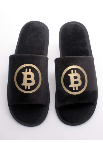 Домашні капці Family story Флекс відкриті чорні із зображенням значка Біткоїн золотого кольору. Дана модель виконана на ЕВА підошві. Верхня частина та устілка - м'який велюр. Модель - унісекс, підходить як чоловікам, так і жінкам.