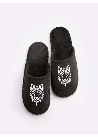 Чоловічі домашні капці із закритим носком. Малюнок із флоковим нанесенням Вовк, на основі чорного кольору. Дана модель виконана на фетровій підошві із спеціальним антиковзаючим покриттям, на верхній частині - еко-замш, устілка - м’який велюр. Капці дуже добре переносять багаторазове прання у пральній машинці. Надзвичайно зручні, невагомі та безшумні.