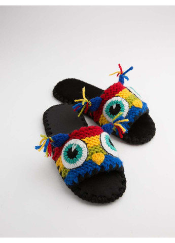 Домашні капці повністю ручної роботи з мордочкою Кольорової Совушки. Дана модель є у наявності на ЕВА-підошві. В своїй основі капці складаються із фетру, устілка виконана із мякого велюру, а сама мордочка в’яжеться руками нитками із вовни. Взуття підлягає пранню в пральній машинці на делікатному режимі.