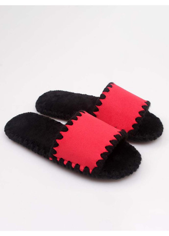 Домашні капці на основі червоного кольору із відкритим носком. На верхній частині - еко-замш, устілка - м’який велюр. Капці дуже добре переносять багаторазове прання у пральній машинці. Надзвичайно зручні, невагомі та безшумні.