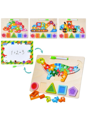 ігрове поле 30-22,5см, 15дет, 2в1(дошка для малювання маркером), геометрика, геометричні фігури, маркер, мікс видів (транспорт, динозаври), у пакеті