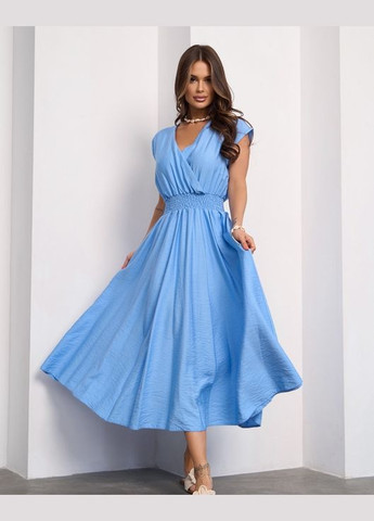 Літній лляний сарафан блакитного кольору з боковою зав'язкою. Модель без рукавів із напівкруглою горловиною. Виріб вільного розкльошеного крою міді завдовжки. Напівобхват: Груди: S (50), M (50), L (54), XL (54), XXL (59), 3XL (59), 4XL (63), 5XL (63), Талія: S (55), M (56), L (59), XL (55-59), XXL (63), 3XL (64), 4XL (67), 5XL (67), Стегна: S (60), M (60), L (63), XL (62), XXL (68), 3XL (69), 4XL (71), 5XL (71), Довжина виробу - 113, Тканина: Низької еластичності. Парметри моделі: Зріст: 165 см; Груди: 88 см; Талія: 63 см; Стегна: 90 см; На моделі розмір: S