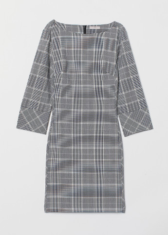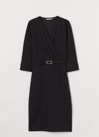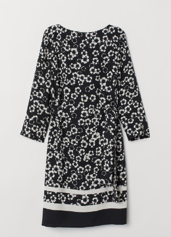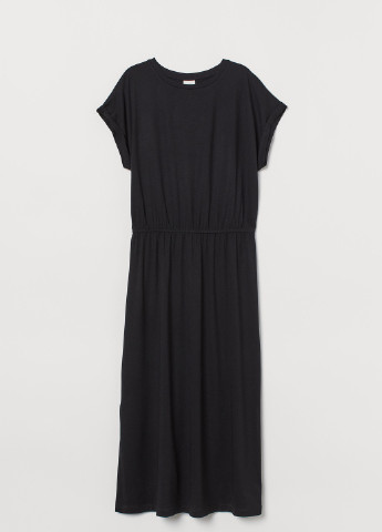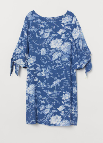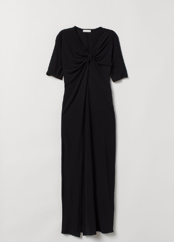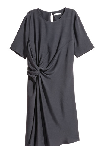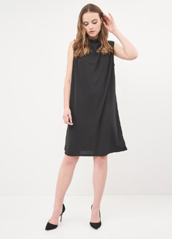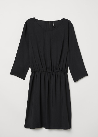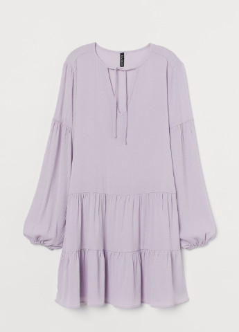 Коротка сукня-трапеція із жатої віскозної тканини з круглим вирізом горловини, невеликим розрізом на зав'язках спереду та довгими рукавами з манжетами на вузькій резинці. Відрізне по складанню знизу та на рукавах для створення додаткового об'єму та м'якого драпірування. Без підкладки.
