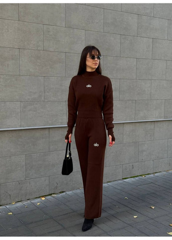 Цей костюм являє собою елегантний та функціональний комплект, що складається з джемпера (або светра) та штанів, виготовлених з м'якої та теплої в'язаної тканини в рубчик.