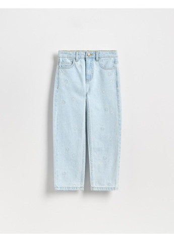 Джинси прямого крою польського бренду Reserved, виготовлені з бавовни. Регульований пояс, застібка на блискавку та ґудзик, п'ять кишень, довгі штанини, декоративна вишивка