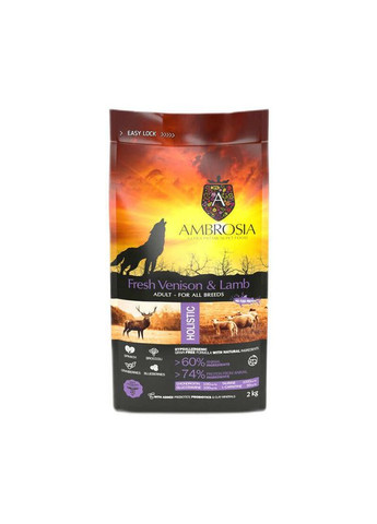 Зелений горошок, картопляні пластівці та насіння льону підтримують роботу травної системи, тоді як пребіотики) сприяють здоровій мікрофлорі кишківника. Лососева олія забезпечує надходження омега жирних кислот, що позитивно впливають на стан шерсті та шкіри. Натуральні овочі та ягоди — шпинат, броколі, помідори, журавлина та чорниця — багаті на антиоксиданти, які зміцнюють імунітет та захищають клітини від старіння. Для підтримки суглобів у формулу додані елементи та мінерали, які забезпечують комплексний догляд за здоров’ям собаки. L-карнітин допомагає підтримувати оптимальну вагу та активність, а таурин дбає про серцево-судинну систему. Цей корм — ідеальне поєднання м’яса ягняти й оленини, збалансованих вітамінів та мінералів для довгого, активного та здорового життя вашого улюбленця. Переваги сухого корму для дорослих собак Ambrosia: Високий вміст білка та енергетична цінність. Легко засвоюється, дбає про здоров’я кишківника. Містить натуральні антиоксиданти. Підходить для активних собак. Омега-3 та омега-6 для шерсті та шкіри. Допомагає продовжити активне життя суглобів. Натуральні овочі та ягоди. Має приємний смак. Хочете порадувати свого песика якісним та смачним сухим кормом для собак? У нас є безліч варіантів, які точно сподобаються вашому домашньому улюбленцю. Склад: Ягня (20%, з них свіжа ягнятина без кісток 10% і дегідратований білок ягняти 10%), зелений горошок, зелений колотий горошок, сушені картопляні пластівці, зневоднений тваринний білок (11%), свіжа оленина (10%), гідролізований тваринний білок (10%), тваринний жир (9,5%), сушений буряковий жом, насіння льону, картопляний білок, мінерали, дріжджовий екстракт (природне джерело MOС (маннан-олігосахаридів) і бета-глюканів), лососева олія, сушений цикорій (природне джерело ФОС (фруктоолігосахариди) та інуліну), сушені пивні дріжджі, сушена броколі, сушений шпинат, сушені помідори, сушена журавлина, сушена чорниця, глюкозамін гідрохлорид (100 мг/кг), хондроїтину сульфат (100 мг/кг), сушені трави (Rosemarinus sp, Curcuma sp, Citrus sp, Eugenia sp). Аналіз інгредієнтів: сирий білок 30,0%, сирий жир 20,0%, омега-3 жирні кислоти 0,6%, омега-6 жирні кислоти 2,5%, неорганічні речовини 8,5%, груба клітковина 3,0%, вологість 9,0%, Ca (кальцій) 1,8%, P (фосфор) 1,2%. Добавки (на кг): вітамін А 14 000 МО, вітамін D3 1 350 МО, вітамін Е 400 мг, таурин: 1 000 мг, L-карнітин 50 мг, залізо (сульфат заліза(II) (моногідрат)) 50,0 мг, мідь (сульфат міді(II) (пентагідрат)) 10,0 мг, цинк (сульфат цинку(II) (моногідрат)) 60,0 мг, марганець (сульфат марганцю(II) (моногідрат)) 5,0 мг, йод (йодат кальцію) 1,5 мг, селен (селеніт натрію) 0,2 мг, антиоксиданти. Рекомендації з годування: Вага собаки, кг Добова норма, гр 8-10 133-157 10-15 157-213 15-20 213-264 20-25 264-312 25-30 312-357 30-40 357-443 40-50 443-524 *Кількість корму залежить від віку, активності та фізіологічного стану тварини. Забезпечте постійний доступ до чистої води. Умови зберігання: Зберігайте корм у сухому, недоступному для дітей місці. Термін придатності вказано на упаковці.
