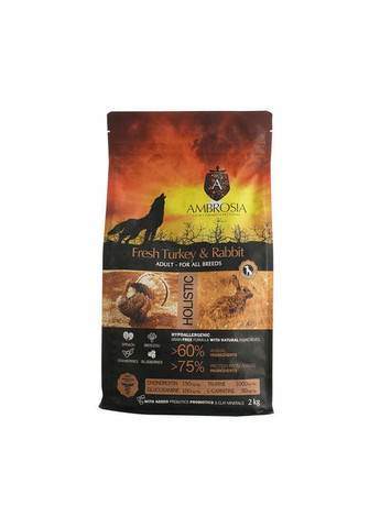 Джерелами вуглеводів виступають картопляні пластівці, горох і колотий горох — вони легко засвоюються та підтримують стабільний рівень енергії протягом дня. Лососева олія, насіння льону та пташиний жир багаті Омега-3 та Омега-6 жирними кислотами, які позитивно впливають на здоров’я шкіри та блиск шерсті. Для підтримки травлення корм збагачений пребіотиками та екстрактом юки, які сприяють здоровій мікрофлорі кишківника та зменшенню неприємного запаху. Додатково овочі і ягоди (броколі, шпинат, помідори, журавлина, чорниця) забезпечують антиоксидантами, вітамінами та мікроелементами для зміцнення імунітету. Глюкозамін і хондроїтин підтримують здоров’я суглобів і рухливість, а комплекс рослинних екстрактів насичують необхідними мікроелементами. Цей корм — ідеальний вибір для собак із чутливим травленням, адже він не містить зернових, виготовлений з якісних інгредієнтів та забезпечує щоденне повноцінне харчування. Переваги сухого корму для дорослих собак Ambrosia: Беззернова формула. Висока поживна цінність. Підходить для тварин з чутливим травленням. Легко засвоюється. Дає відчуття ситості надовго. Змінює імунітет. У складі є пребіотики. Містить натуральні овочі та ягоди. Дбає про здоров’я шерсті та шкіри. Підтримує здоров’я суглобів. Смак подобається пухнастикам У нас ви можете знайти якісні сухі корми для собак, які містять лише натуральні інгредієнти для здорового та довгого життя вашого улюбленця! Склад: М’ясо птиці (35%, з них свіжа індичка без кісток 15% і зневоднений білок птиці 20%), сушені картопляні пластівці, пташиний жир (11%), горох, колотий горох, гідролізований білок птиці (10%), зневоднений білок кролика (4%), сушений буряковий жом, насіння льону, сушений цикорій (природне джерело ФОС та інуліну), сушені пивні дріжджі, лососева олія (0,5%), MOS (маннанові олігосахариди) і бета-глюкани, мінерали, сушена броколі, сушений шпинат, сушені помідори, сушена журавлина, сушена чорниця, глюкозамін гідрохлорид (150 мг/кг), хондроїтину сульфат (150 мг/кг), екстракт рослин (Yucca schidigera, Rosemarinus sp, Vitis sp, Curcuma sp, Citrus sp, Eugenia sp). Рекомендації з годування: Вага собаки, кг Добова норма, гр 2-4 40-65 4-8 65-130 8-10 130-155 10-15 155-210 15-20 210-260 20-25 260-310 25-30 310-355 30-40 355-440 40-50 440-520 *Кількість корму залежить від віку, активності та фізіологічного стану тварини. Забезпечте постійний доступ до чистої води. Умови зберігання: Зберігайте корм у сухому, недоступному для дітей місці. Термін придатності вказано на упаковці.