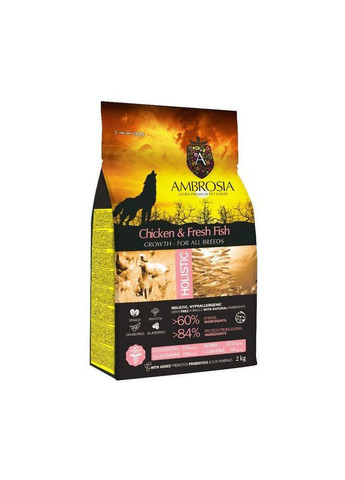 У його складі є курячий жир і лососева олія з, які сприяють здоров’ю шкіри та блиску шерсті. А сушений цикорій, насіння льону та буряковий жом покращують травлення. Підвищений вміст глюкозаміну та хондроїтину зміцнює суглоби, що особливо важливо для активних цуценят у період росту. Також формула містить додаткові вітаміни A, D3, E, а також L-карнітин і таурин, які підтримують здоров’я серця, кісток і м’язів, забезпечуючи високий рівень енергії щодня. Помірний рівень жиру й калорій сприяє підтриманню оптимальної ваги, навіть для активних чи великих порід. Переваги сухого корму для цуценят Ambrosia: Великий вміст білка. Беззернова формула. Підходить для цуценят схильних до алергій. Містить жирні кислоти, які підтримують здоров’я шкіри та блиск шерсті. Дбає про кишківник та зміцнює імунітет. Підтримує здоров’я суглобів під час росту. Має у своєму складі свіжі овочі та фрукти. Додатково насичений вітамінами A, D3, E. Помірний рівень жиру й калорій. У нас сайті можна знайти сухі корми для собак, які смакуватимуть навіть найвишуканішому гурману. Склад: Риба (21%, з яких свіжий лосось 15% і висушений оселедець 6%), висушена курка (19%), сушена картопля, зелений горошок, зелений лущений горох, курячий жир (11%), гідролізований білок курки (8%), буряковий жом, насіння льону, мінерали, сушені пивні дріжджі, олія лосося (0,5%), сушений цикорій (натуральне джерело фруктоолігосахаридів та інуліну), мананоолігосахариди, сушена броколі, сушений шпинат, сушена журавлина, сушена чорниця, гідрохлорид глюкозаміну (150 мг/кг), хондроїтину сульфат (150 мг/кг), суміш рослинних екстрактів (розмарину, винограду, куркуми, цитрусових і сізігіума). Вітаміни: Вітамін А (МО/кг): 14 000, Вітамін D3 (МО/кг): 1 350 МО, Вітамін Е: 400 мг. Амінокислоти: Таурин: 1000 мг, L-карнітин: 50 мг. Мікроелементи: Залізо (залізо (II) сульфат (моногідрат)) 100 мг, Мідь (міді(II)сульфат (пентагідрат)) 12 мг, Цинк (сульфат цинку (II) (моногідрат)) : 125 мг, Марганець (сульфат марганцю (II) (моногідрат)) :5,0 мг, Йод (йодат кальцію) : 1,5 мг, Селен (селеніт натрію): 0,2 мг. Риба (21%, з яких свіжий лосось 15% і висушений оселедець 6%), висушений оселедець 6%), висушена курка (19%), сушена картопля, зелений горошок, зелений лущений горох, курячий жир (11%), гідролізований білок курки (8%), буряковий жом, насіння льону, мінерали, сушені пивні дріжджі, олія лосося (0,5%), сушений цикорій (натуральне джерело фруктоолігосахаридів та інуліну), мананоолігосахариди, сушена броколі, сушений шпинат, сушена журавлина, сушена чорниця, гідрохлорид глюкозаміну (150 мг/кг), хондроїтину сульфат (150 мг/кг), суміш рослинних екстрактів (розмарину, винограду, куркуми, цитрусових і сізігіума). Аналітичні компоненти: Білок 32%, жир 22%, омега-3 жирні кислоти 0,9%, омега-6 жирні кислоти 3%, неорганічні речовини 7%, сира клітковина 2,5%, волога 9%, Ca (кальцій) 1,4%, (фосфор)1%. Вага собаки (кг) 2 місяці (г) 3 місяці (г) 6 місяців (г) 9 місяців (г) 12 місяців (г) 18 місяців (г) ≤ 1 59 68 65 62 Дорослий Дорослий 2 59 68 65 62 Дорослий Дорослий 5 109 124 122 114 Дорослий Дорослий 7 134 151 155 143 Дорослий Дорослий 10 168 190 200 190 182 Дорослий 15 216 247 265 253 238 Дорослий 20 Велике цуценя Велике цуценя 323 313 289 Дорослий 25 Велике цуценя Велике цуценя 376 369 350 335 Щоденних годувань 3 3 3 2 2 2 *Кількість корму залежить від віку, активності та фізіологічного стану тварини. Забезпечте постійний доступ до чистої води. Умови зберігання: Зберігайте корм у сухому, недоступному для дітей місці. Те