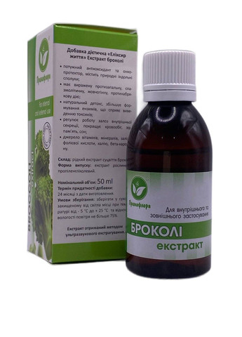 Рідкий екстракт суцвіття броколі має багато цілющих властивостей. А саме: потужний антиоксидант та онкопротектор, містить природні індольні сполуки; має виражену протизапальну, спазмолітичну, жовчогінну, протинабрякову дію; натуральний детокс, збільшує формування ензимів, що сприяє виведенню токсинів; регулює роботу залоз внутрішньої секреції, покращує кровообіг, зір, пам’ять, сон; джерело вітамінів, мінералів, заліза, фолієвої кислоти, калію, бета-каротину. потужний антиоксидант та онкопротектор, містить природні індольні сполуки; має виражену протизапальну, спазмолітичну, жовчогінну, протинабрякову дію; натуральний детокс, збільшує формування ензимів, що сприяє виведенню токсинів; регулює роботу залоз внутрішньої секреції, покращує кровообіг, зір, пам’ять, сон; джерело вітамінів, мінералів, заліза, фолієвої кислоти, калію, бета-каротину. Склад: рідкий екстракт суцвіття броколі Дія на системи: Органи кровотворення, лімфатична та імунна система – виявляє антигіпоксичну, мембраностабілізуючу, цитопротекторну, оксигеназну, антирадикальну, дезінтоксикаційну активність. Ефективно посилює очисну функцію організму. Прискорює процеси знешкодження токсинів, покращує реологічні властивості крові, коригує функціональні процеси в лімфатичній системі. Має виражену антиоксидантну та антибактеріальну дію, протидіє шкідливому впливу вільних радикалів, підсилює імунітет, надає тонізуючий ефект. Сприяє процесам детоксикації в печінці та селезінці, попереджує формування грибкових процесів в організмі, має здатність очищувати лімфатичну систему. Актуальний для допоміжної підтримки організму при алергічних та аутоімунних захворюваннях будь-якого генезу. Гальмує розвиток папіломавірусу, виникнення папіломатозних утворень. Показаний при хронічному гепатиті, аутоімунних захворюваннях, постковідному синдромі. Ендокринна система – природний активний регулятор проміжного обміну та фізіологічних процесів енергозабезпечення, підтримує гормональний баланс. Коригує вміст у крові інсуліну, статевих гормонів, включається в процеси фібриногенолізу, сперматогенезу, чинить мембранодеполяризуючу дію. Запобігає утворенню в печінці канцерогенних метаболітів, пригнічує синтез стимулятора оксидативного стресу. Стимулює діяльність вилочкової залози, регулює вміст глюкози в крові. Чинить кислотоутворювальну дію та сприяє корекції кислотно-лужної рівноваги. Показаний при порушеннях роботи щитоподібної залози, полікістозі. Травна система – регулює моторику ШКТ, впливає на повноцінне випорожнення кишківника, позитивно впливає на процеси енергозабезпечення в печінці та підшлунковій залозі, що коригує рівень цукру та показники холестерину. Містить збалансований комплекс біологічно активних природних антибактеріальних речовин, які знищують шкідливі бактерії в ШКТ та сприяють збереженню балансу мікрофлори. Сенсорна система – за рахунок бета-каротину та вітамінів В, С, PP сприяє здоров’ю органів зору та слуху. Серцево-судинна система – показаний при атеросклерозі, діабетичній ангіопатії, для поліпшення капілярного кровообігу. Нервова система – бере участь у процесі проведення нервових імпульсів, особливо за рахунок калію та вітамінів групи В. Поліпшує скорочення скелетних м’язів при м’язовій дистрофії. Допомагає при деп