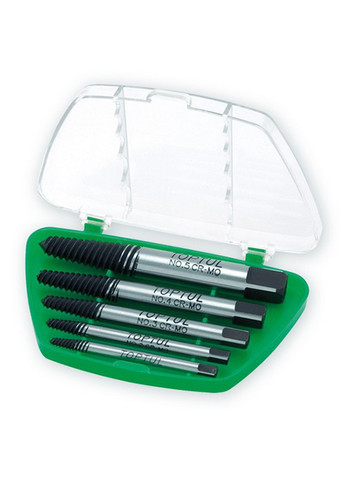 Відправка протягом 1-2 робочих днів. Набір екстракторів (1/8, 1/4, 5/16, 7/16, 9/16) TOPUL JGAW0501. Для використання необхідно просвердлити в центрі зламаного гвинта отвір та вставити екстрактор із правильним розміром. Екстрактор повинен знаходитись у протилежному напрямку до звичайних гвинтових різьблень. Коли екстрактор затягується проти годинникової стрілки, він починає послаблювати гвинт. Зіставлення розміру гвинта та екстрактора: Екстрактор Гвинт 1/8 1/4 3-6 мм 1/4 5/16 6-8 мм 5/16 7/16 8-11 мм 7/16 9/16 11-14 мм 9/16 3/4 14-19 мм Призначення: Ручний; Кількість одиниць, : 5; Кількість інструментів у наборі, : 5;