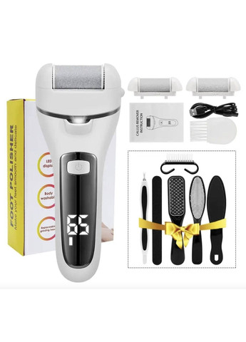 Електрична пемза для ніг ваш ідеальний інструмент для спа-процедур. Машинка для чищення п'ят з двома швидкостями дбайливо видаляє шкіру, що омертвіла, і мозолі, роблячи ваші ноги доглянутими і красивими. Якщо тиск буде надто сильним, запобіжник автоматично зупинить обертання, щоб не пошкодити шкіру. Вбудована літієва батарея на 1200 мАг потужністю 5 Вт заряджається за допомогою USB заряджання протягом 3.5 годин. На корпусі є дисплей, що показує рівень заряду батареї.