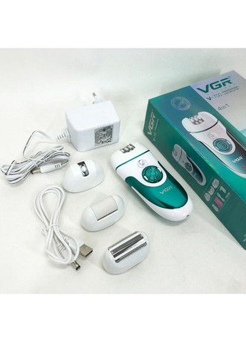 Епілятор VGR V-700 призначений для видалення небажаного волосся на тривалий період – до 4 тижнів! Цей епілятор максимально зручний у використанні, не вислизає з руки, кнопка перемикання режимів розташована так, щоб легко могли її прокручувати. Модель відрізняється ергономічним корпусом з гладкими лініями, підсвічуванням та двома швидкостями. Також має насадку для бритви, насадку-пемзу та вузьку насадку-епілятор. Характеристики: Фірма: VGR; Модель: V-700; Кількість насадок: 4; Матеріал корпусу: пластик; Потужність: 3 Вт; Живлення: від акумулятора; Тип елементів живлення: Ni-MH; Ємність акумулятора: 2×500 mAh; Час роботи від акумулятора: 50 хвилин; Час до повної зарядки акумулятора: 8 годин; Тип епілятора: пінцетний; Кількість швидкостей: 2; Підсвічування: так; Колір: бірюзовий; Тип епіляції: суха; Розмір: 13 х 5,8 х 2,5 см; Вага: 130 г. Комплектація: Епілятор VGR V-700; Широка насадка для епіляції; Насадка для бритви; Насадка-пемза; Вузька насадка для епіляції; Мережний адаптер для заряджання; USB-кабель для заряджання; Сумочка для зберігання; Невелика губка; Щітка для очищення; Інструкція (англійською мовою); Фірмова упаковка.